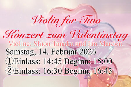 2 Konzerte mit dem Violin-Duo Shion Tanaka und Ian Mardon. Werke von Boccherini, Haydn, Wieniawski u.a. Am Samstag, den 14.02.2026 1. Beginn 15:00 Uhr – Einlass 14:45 Uhr 2. Beginn 16:45 Uhr – Einlass 16:30 Uhr Kling und Klang Alter Teichweg 61 22049 Hamburg Eintritt: